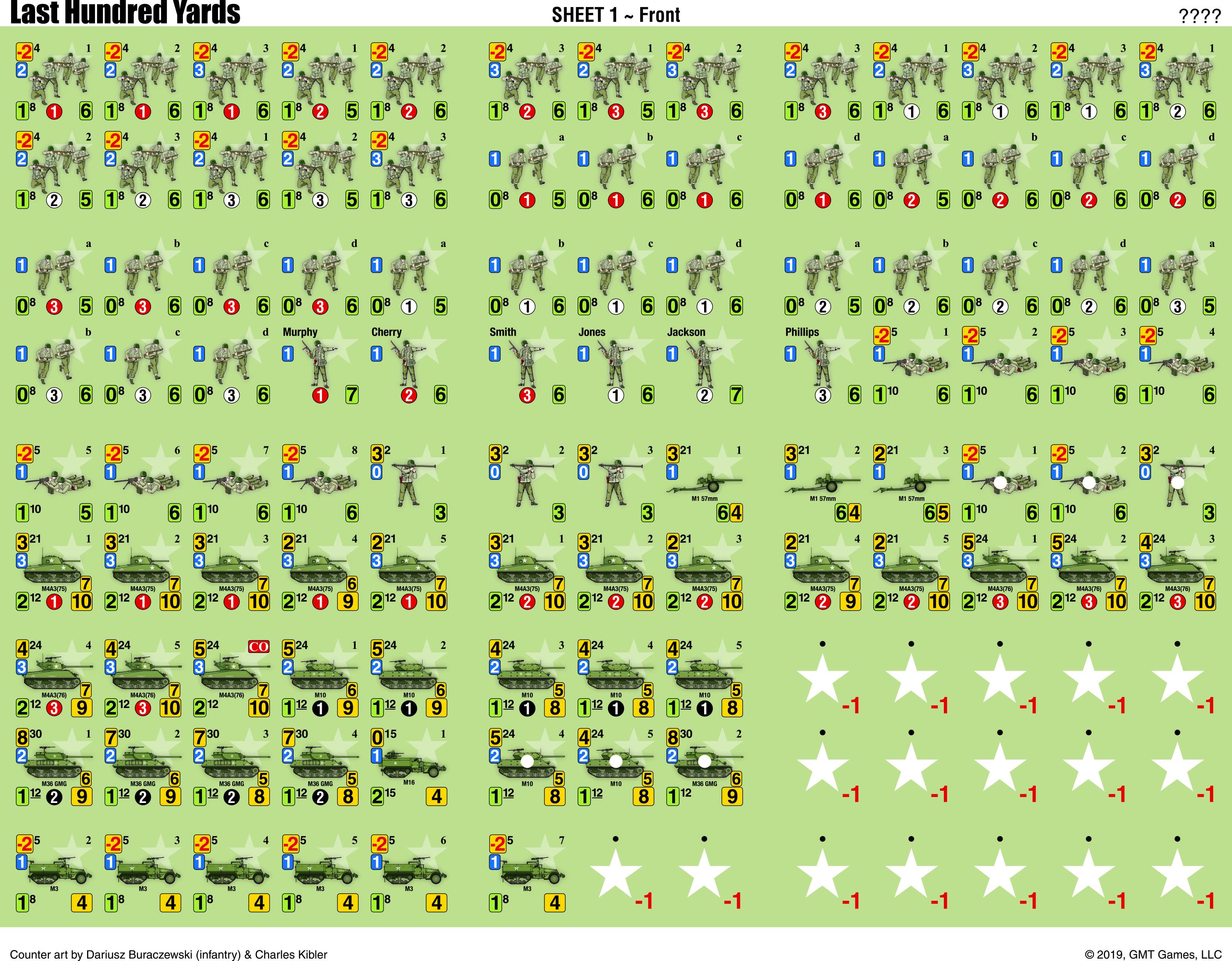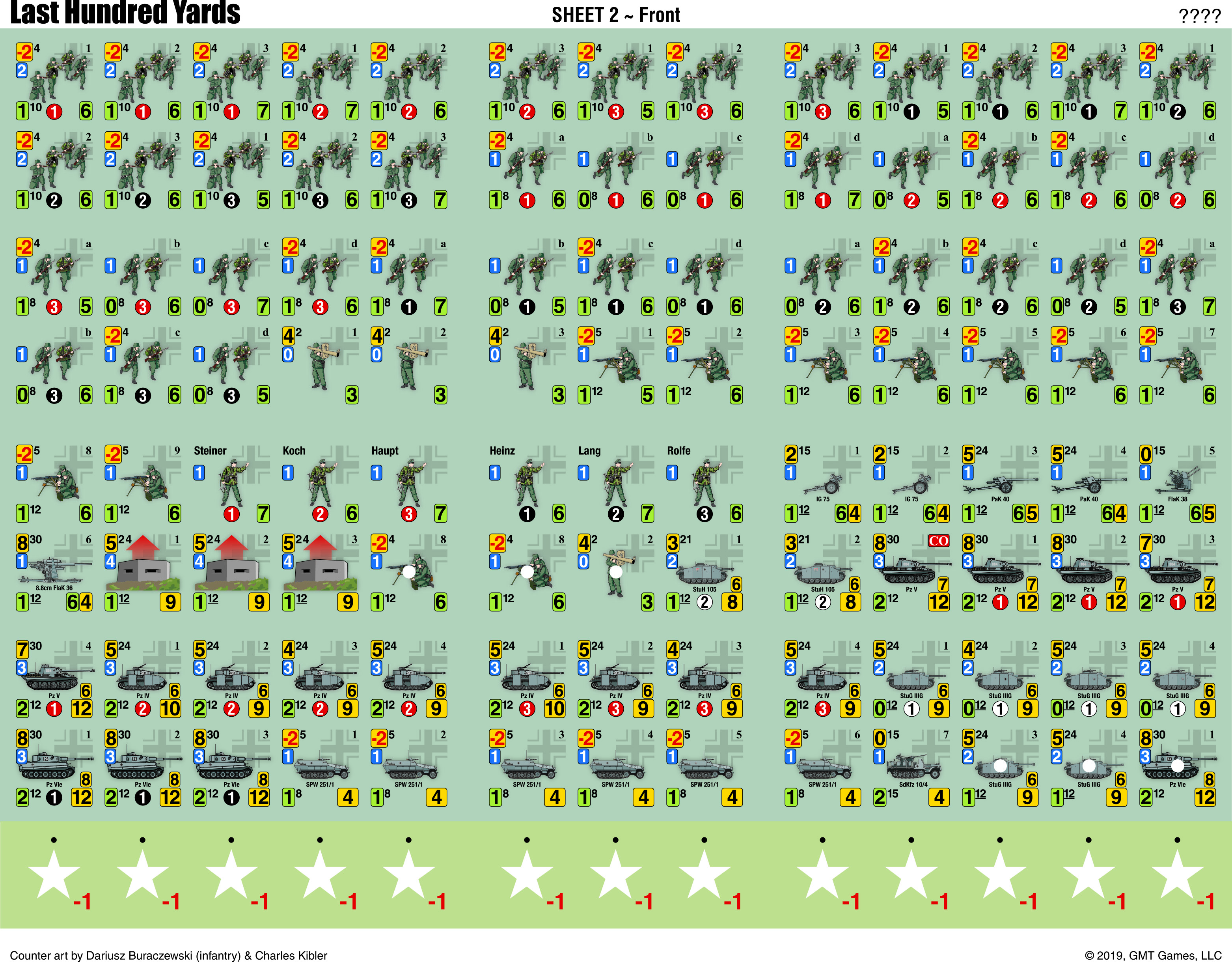 Fire Mechanics: Fire mechanics in The Last Hundred Yards are based on the premise that during the short span of a few minutes in a game turn, fire is focused on a specific enemy unit as it fires or maneuvers. To reflect this, DRM markers are used to represent the enemy unit or units under fire and the amount of fire power placed on them. A different color DRM marker is used for each type of fire (green for small arms fire, yellow for anti-tank fire and red for indirect fire). Note that neither player will see the results of his fire until the Fire Resolution Phase occurring after all platoons of the active player have been activated. The following Fire Resolution is extremely fast and simple. The firing player rolls a single sided 10 die for each of his DRM markers in play, adding or subtracting the DRM of this DRM marker to the die roll, then comparing it to the defensive value of the enemy unit. Combat results are Disruptions or Casualty Reductions.